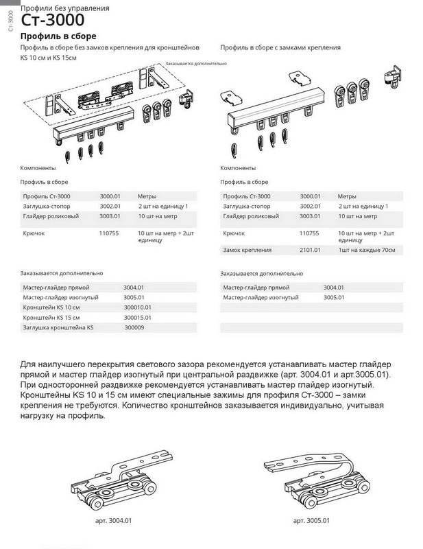 Комплектация: профиль, боковые заглушки, глайдеры выбранного типа (роликовые или "клик") из расчёта по 10 шт. на каждый метр профиля;